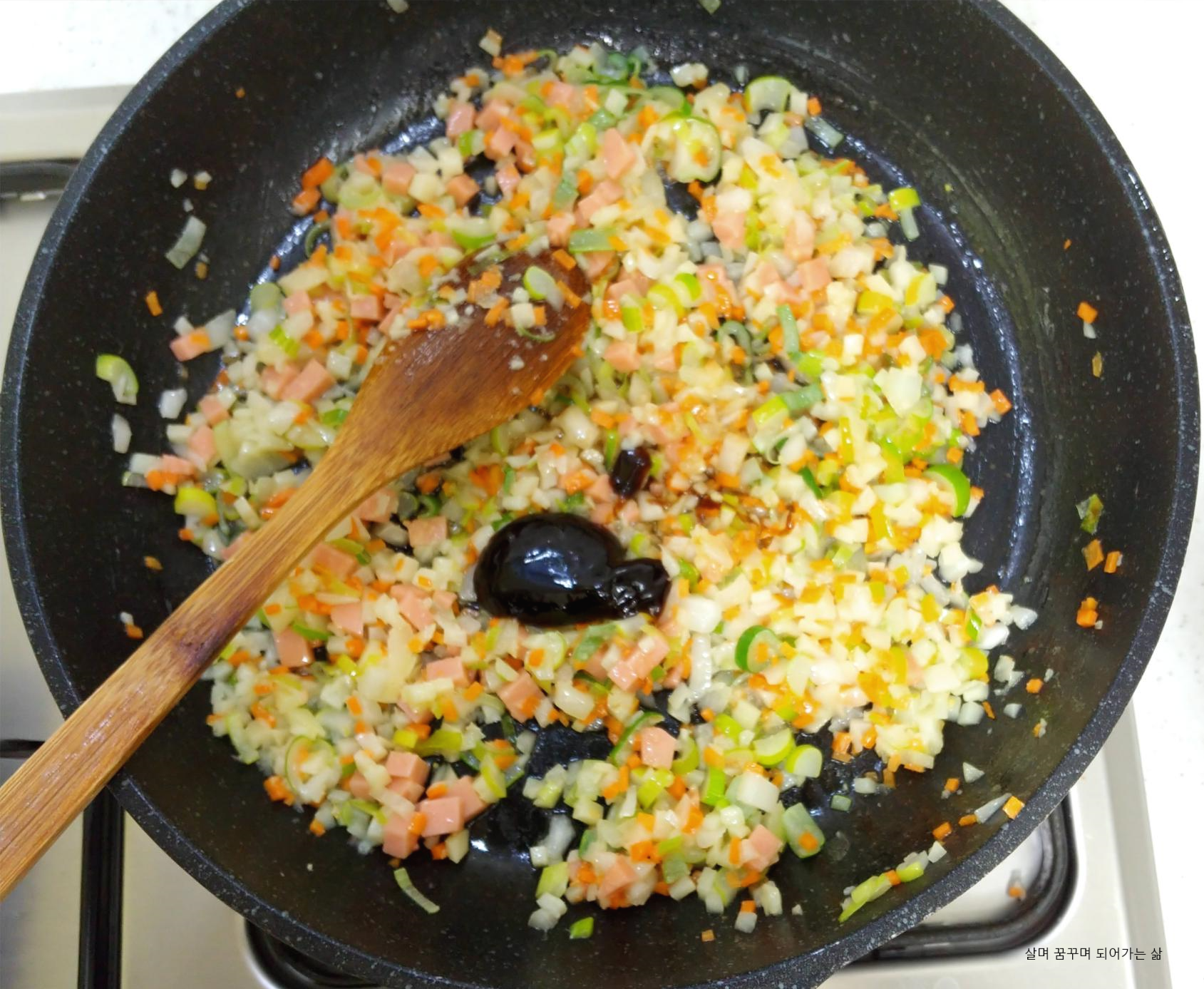 저는 먹다 남은 진주햄 소시지가 있어서 그걸 넣고 야채 햄 볶음밥을 해 먹었어요.