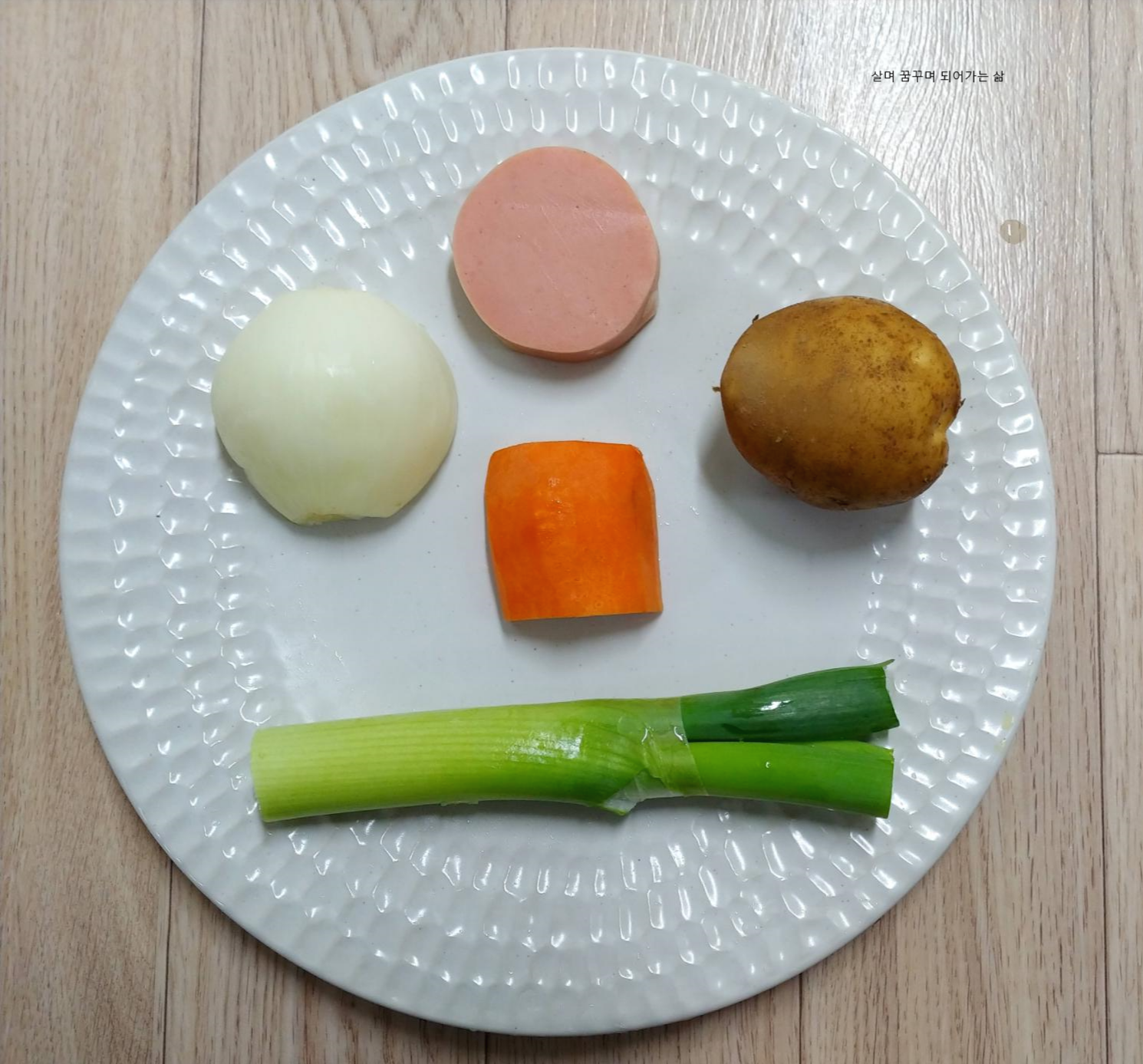대파 50g, 당근 30g, 양파 70g, 감자 100g, 햄 50g, 식용유, 통깨, 계란 1알, 굴소스 1T, 간장 1T