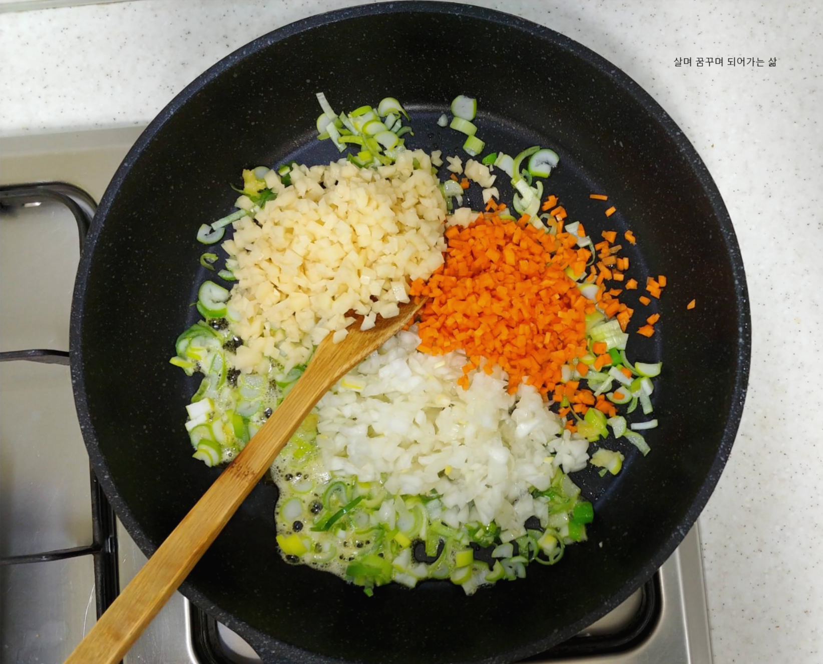 당근, 감자, 양파를 한꺼번에 넣고 볶아주었어요.
