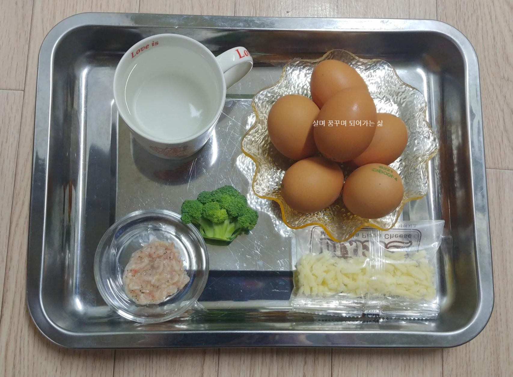 계란 6알, 브로콜리 15g, 물 200g, 치즈 20g, 새우젓, 소금. 볶은깨.