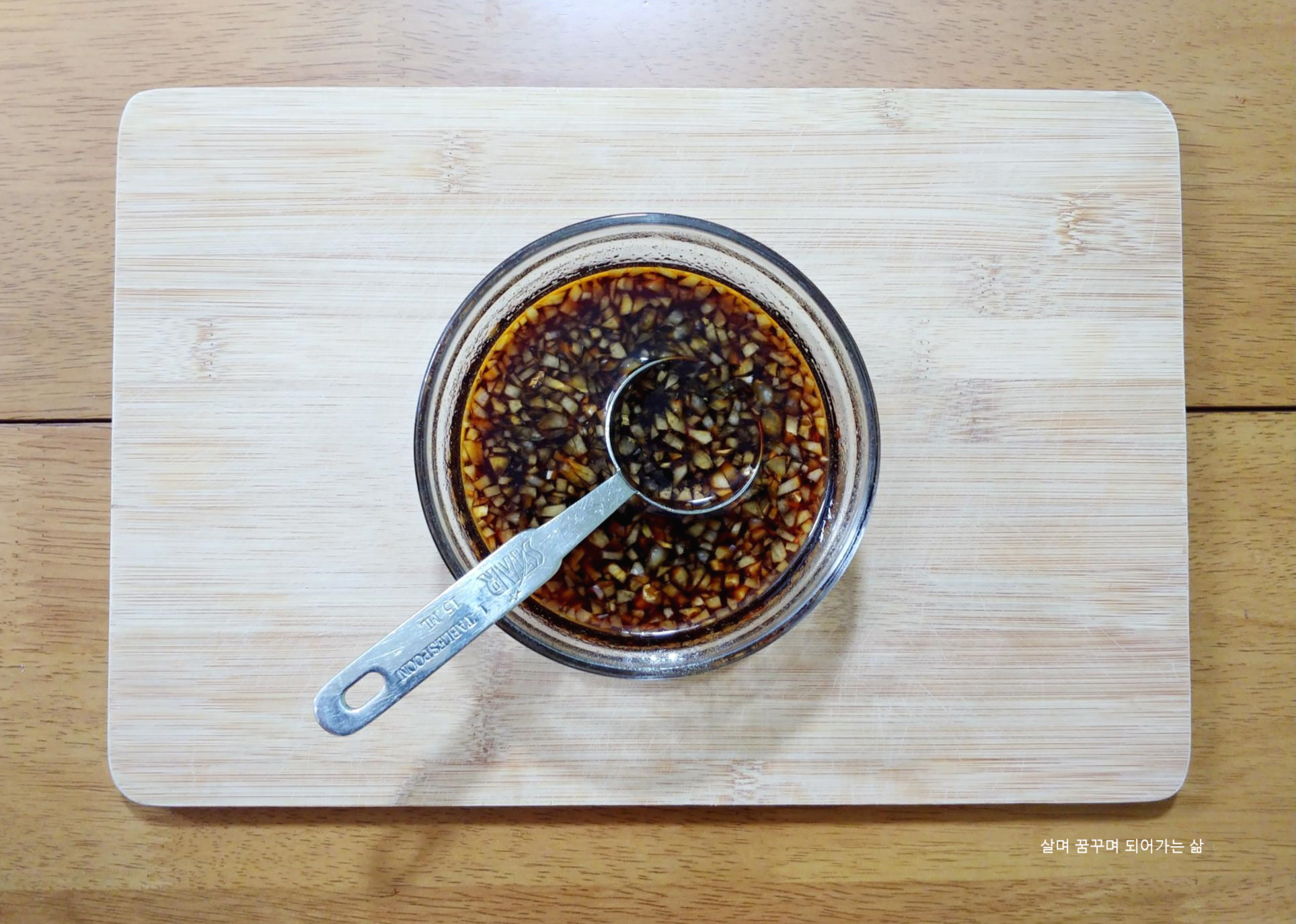 매실액 1, 간장 4, 맛술 2, 다진 마늘, 후춧가루 약간, 다시물 1컵.