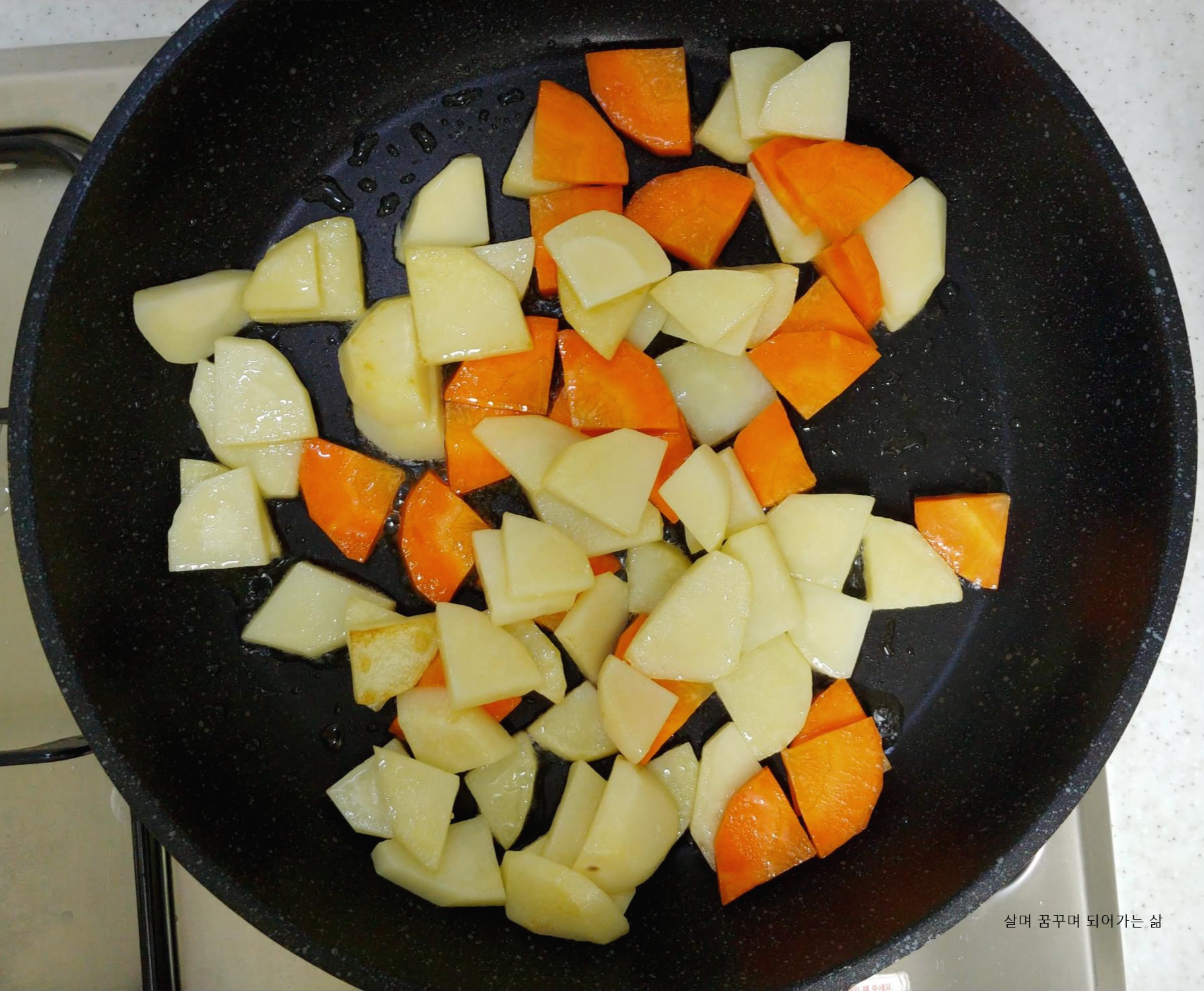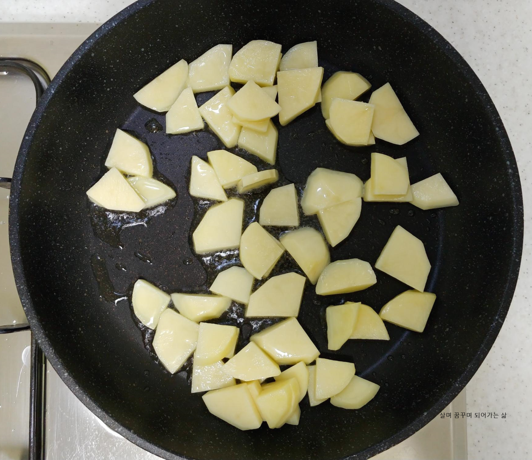 달군 팬에 식용유를 둘러 주고 가장 먼저 감자를 볶아요.