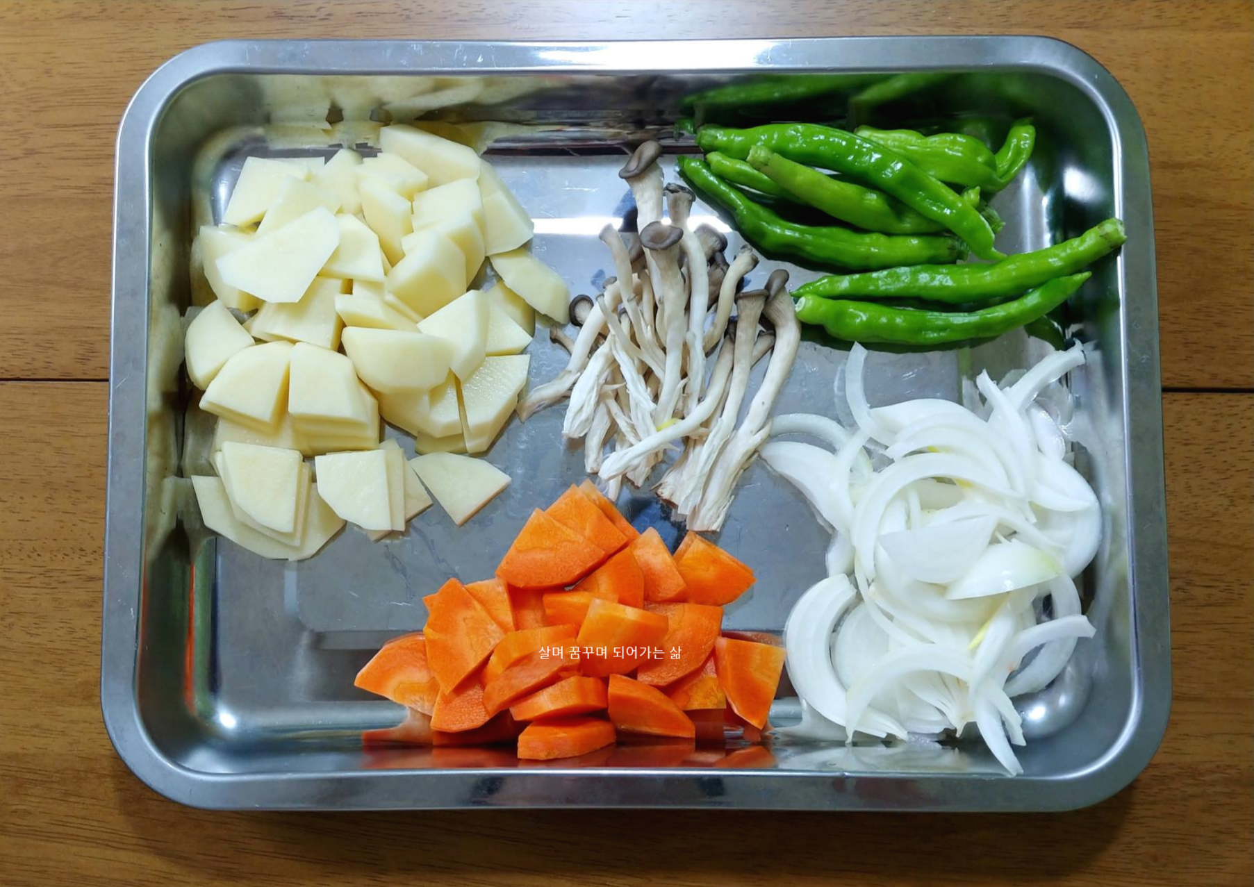 감자 2개, 양파 1/2개, 당근 조금, 버섯 조금, 꽈리고추 한 줌, 마늘 3개.