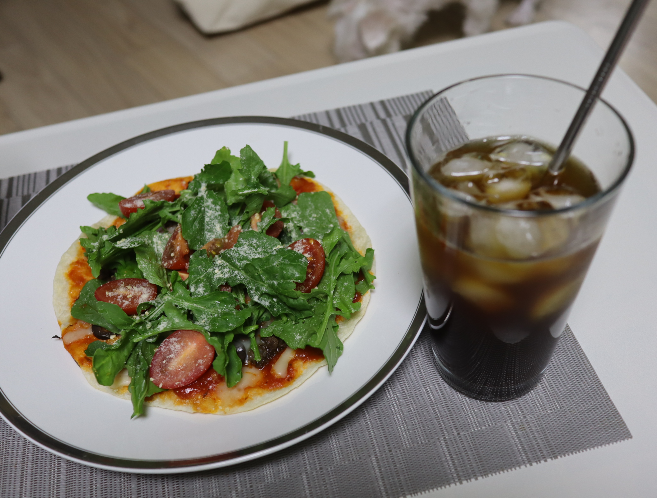 우리밀또띠아 3장, 루꼴라50g, 방울토마토8개, 스파게티소스70g, 분쇄소고기볶음40g, 베이컨1줄, 올리브4개, 피자치즈2봉.