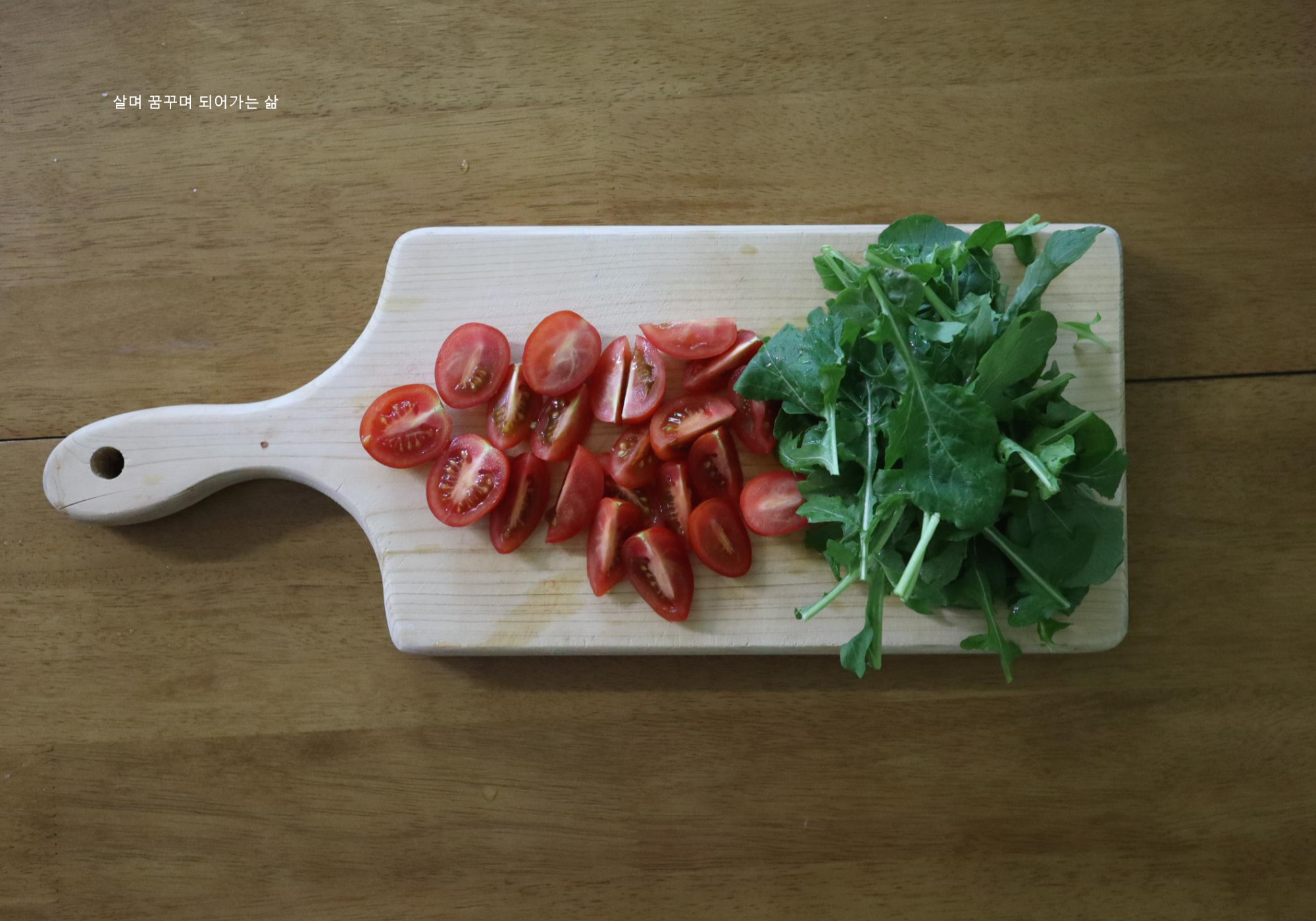 신선한 루꼴라 먹기좋게 뚝뚝 잘라서 듬뿍 올려 주었어요. 그리고 방울토마토도 이쁘게 올려 주었습니다.