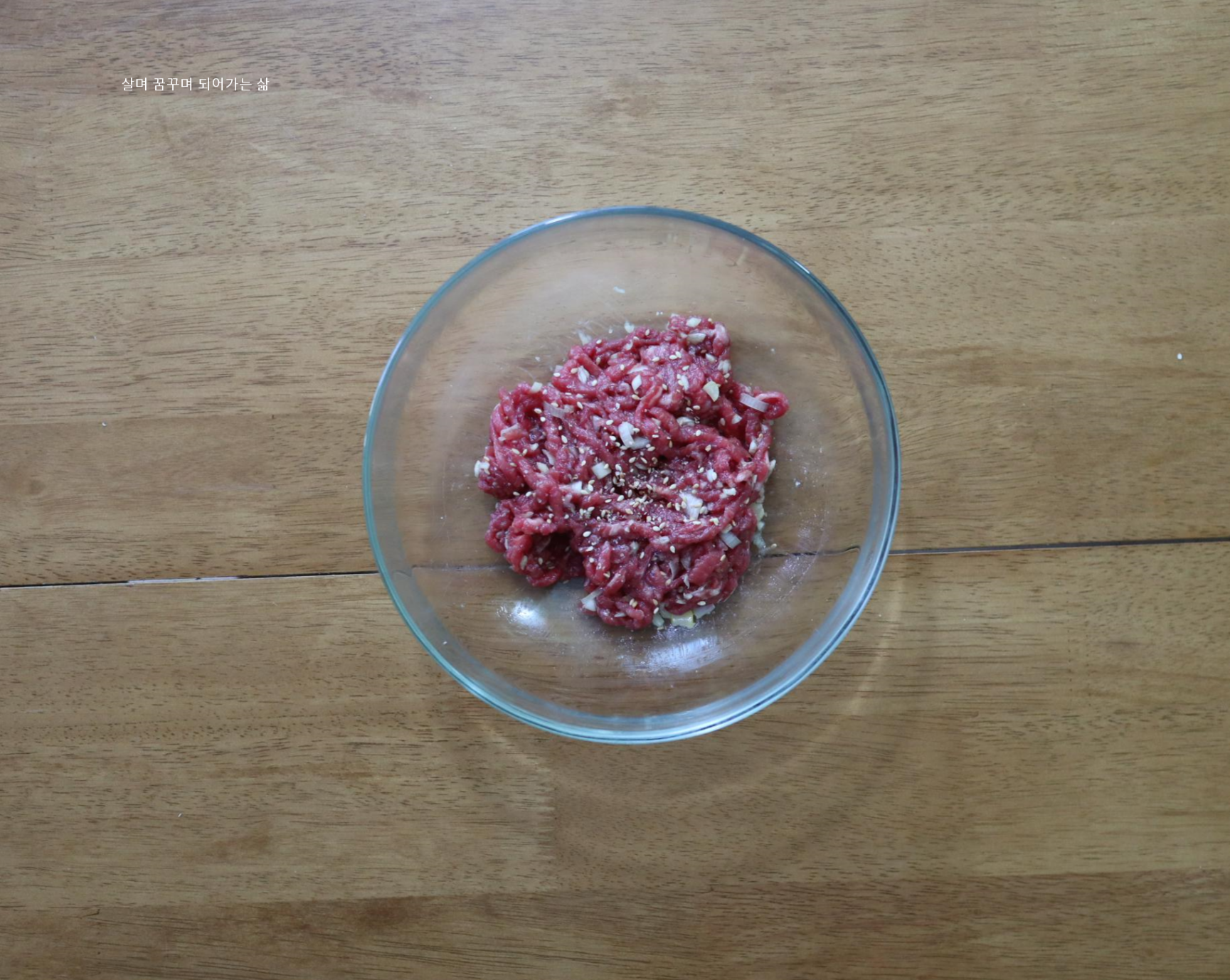육회 양념은 소금1/4T, 설탕1T, 다진마늘1T, 다진파1T, 참기름1T, 깨소금1/2T으로 했어요.