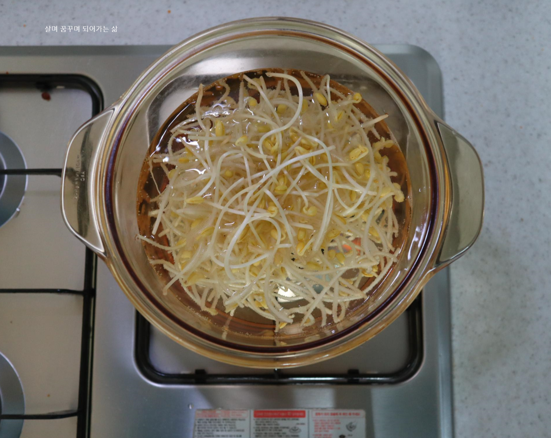 데친 콩나물은 흐르물에 열기를 식혀서 차가운 물에 담가 아삭함을 더했습니다.