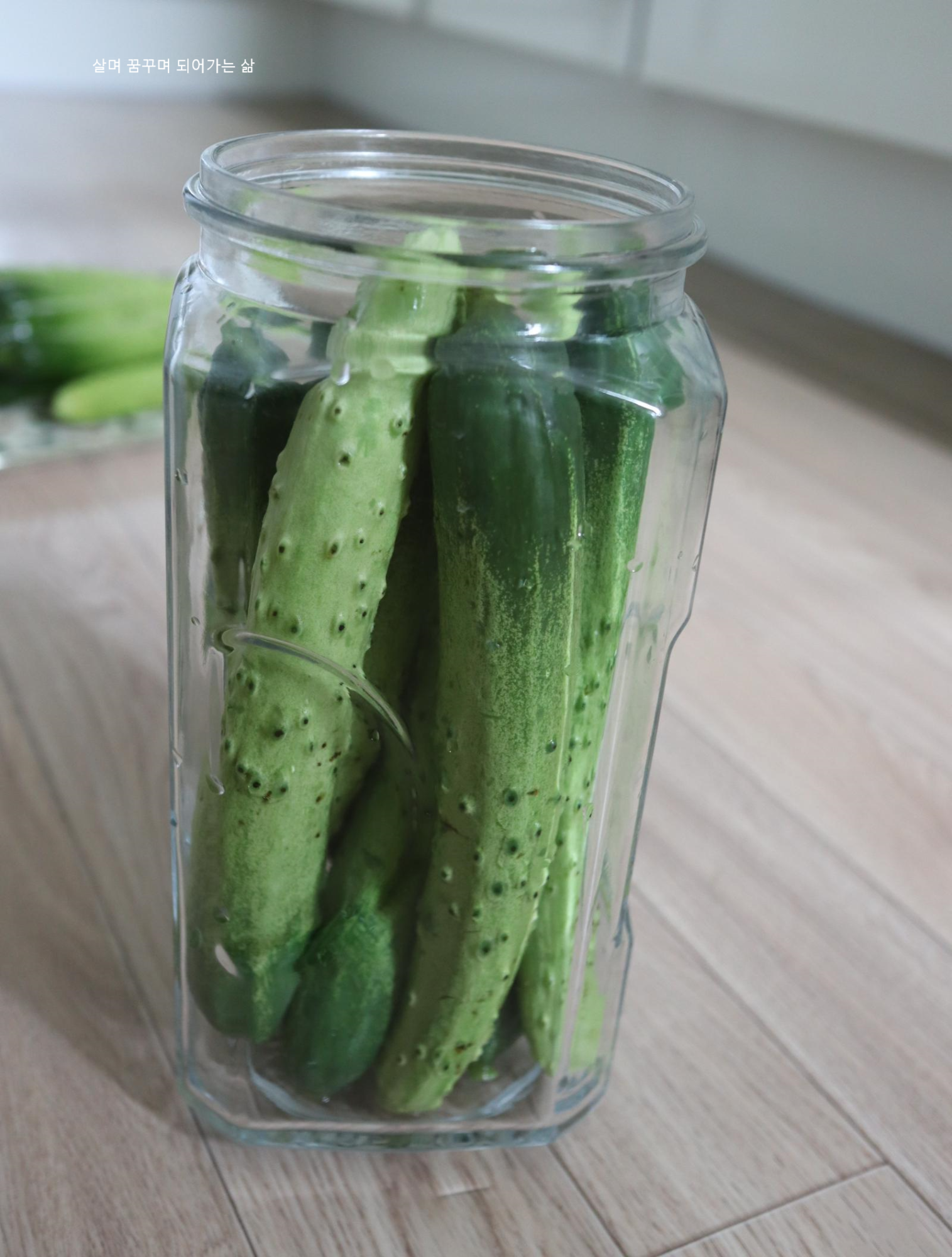 끓는물에 3~5초 데쳐서 소독한 오이들을 장아찌를 담글 그릇에 차곡차곡 담아줍니다.