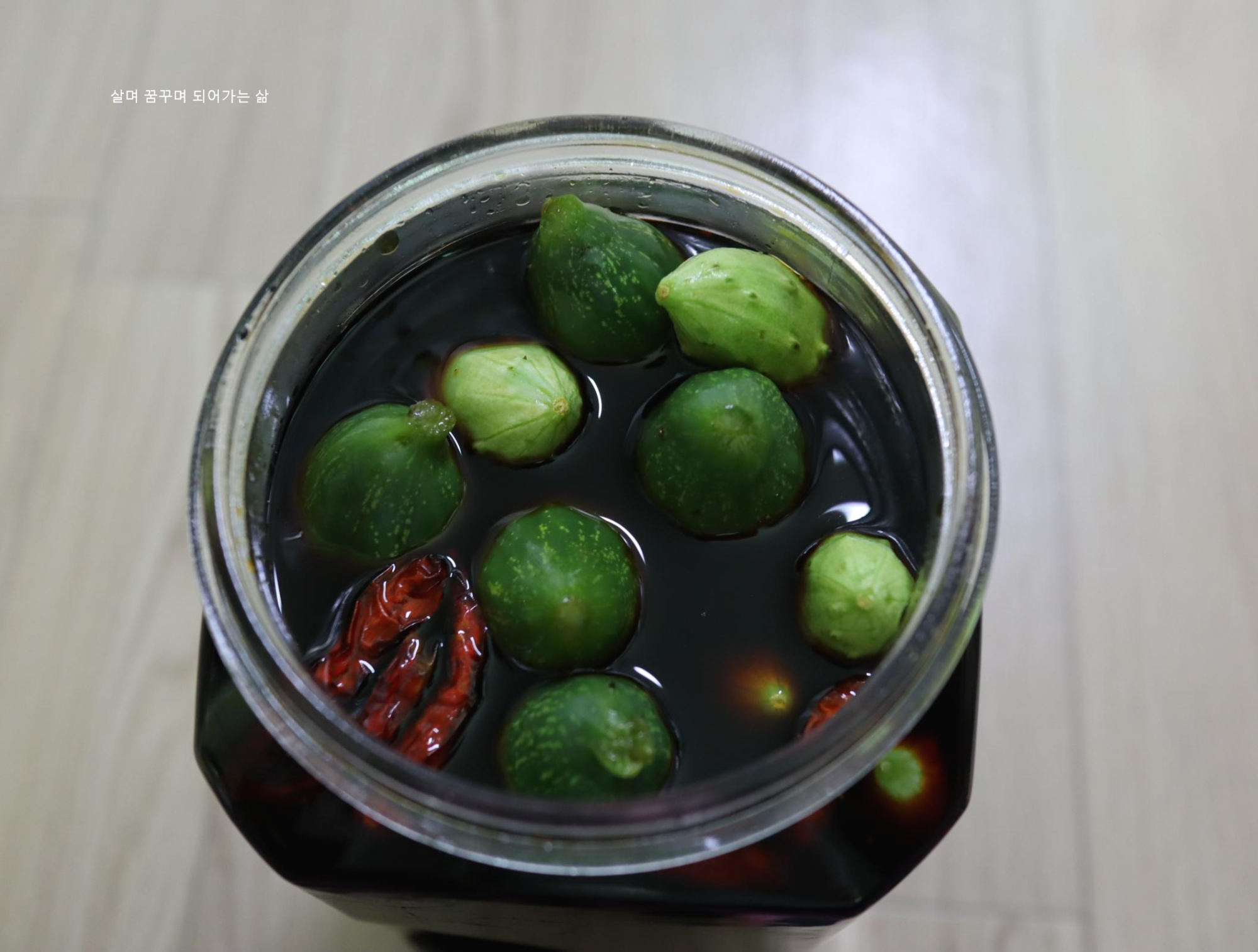 장물을 부었더니 오이가 위로 떠올라서 작은 종지하나 넣어 눌러 주었습니다.