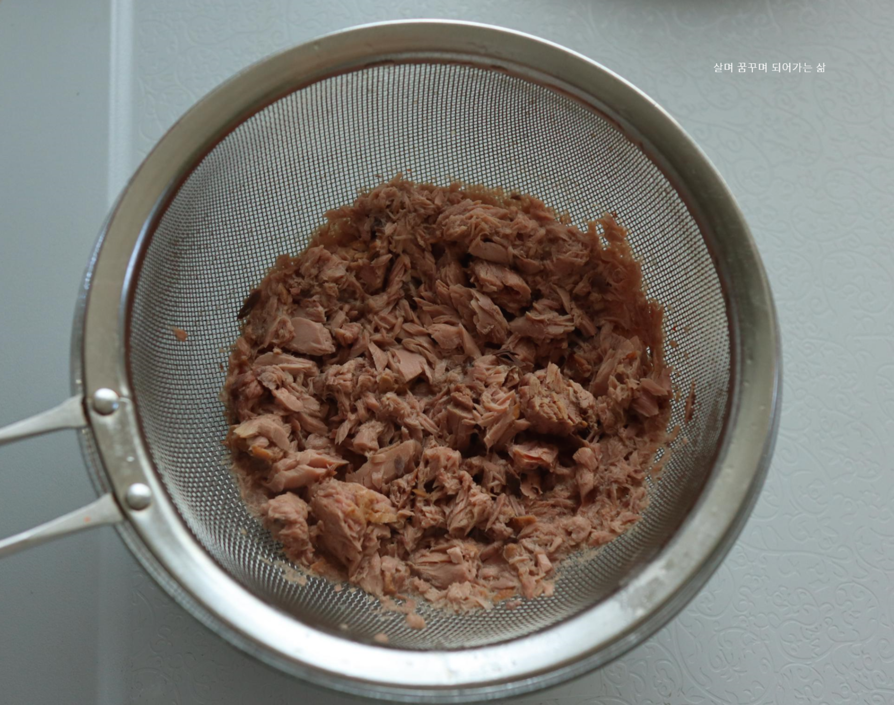 참치캔 속에 있는 기름 등을 제거하기 위해 채에 바쳐서 제거해 줍니다.