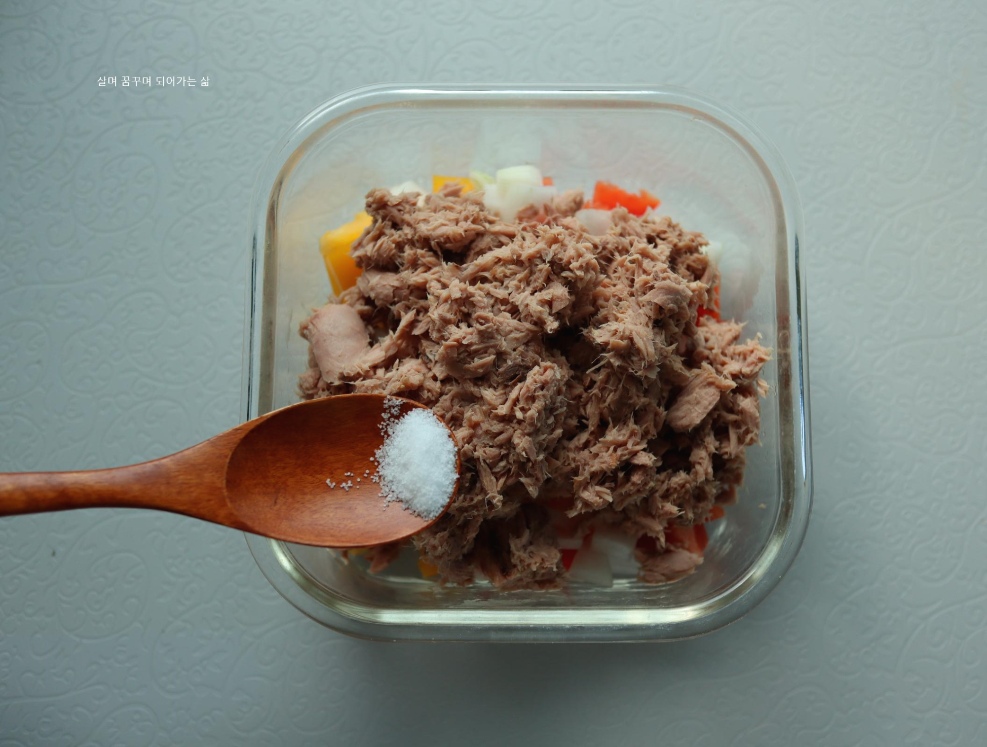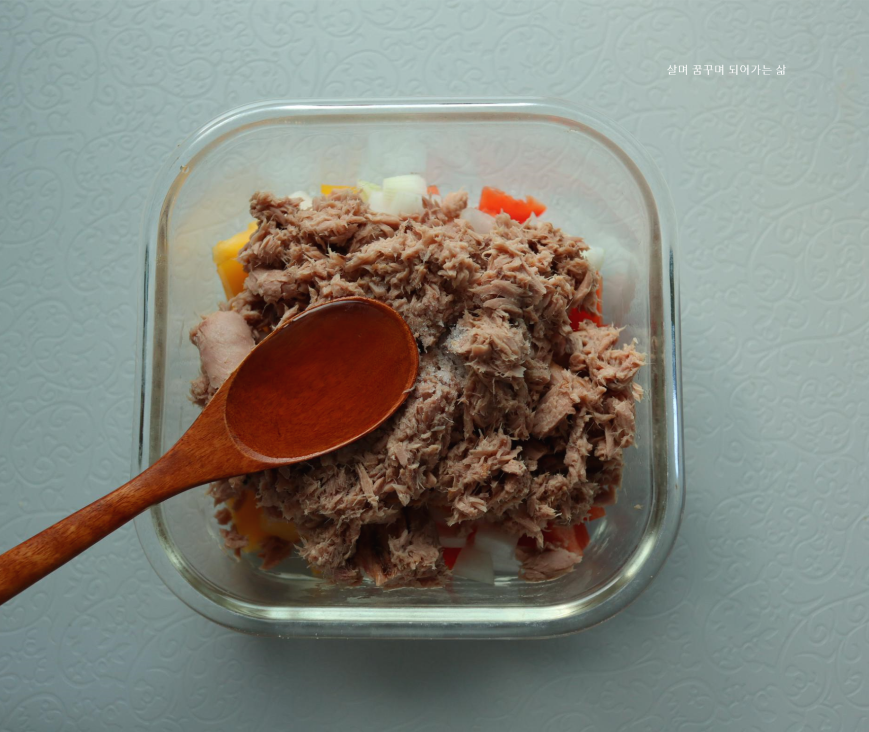 참치살이 캔속에 오랫동안 보관되어 있었기 때문에 다양한 분순물이 있을 것 같은 느낌이 들어서 뜨거운 물을 끓여서 부어 주었어요. 그리고 여분의 수분을 수저로 꾹꾹눌러 제거해 주었어요.