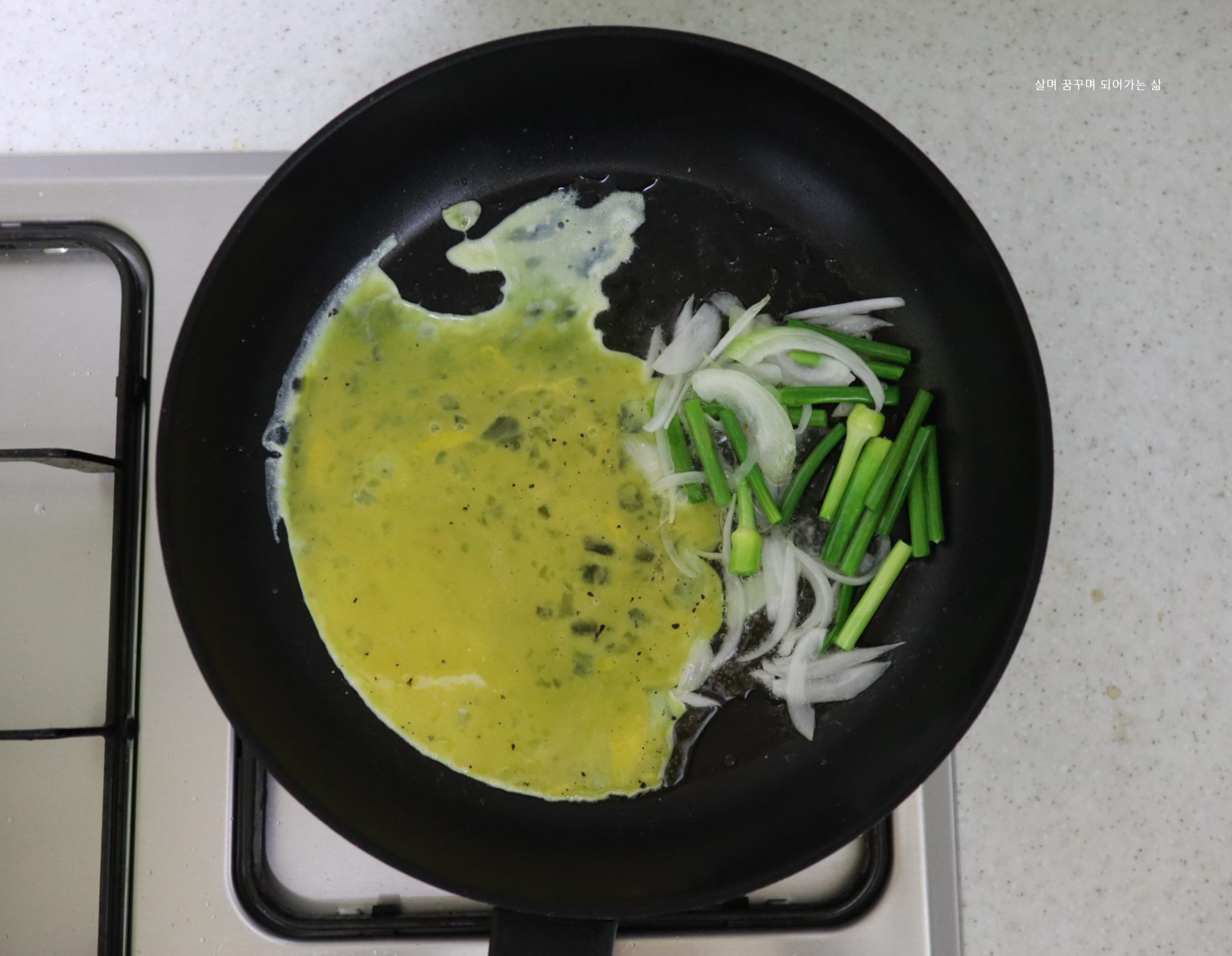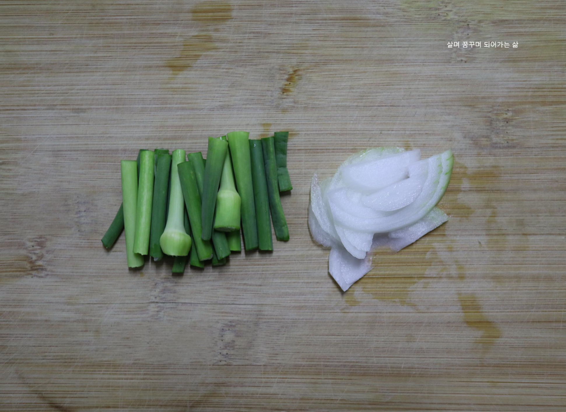 팬이 적당히 달구어 지면 식용유를 두르고 마늘종과 양파를 볶습니다.