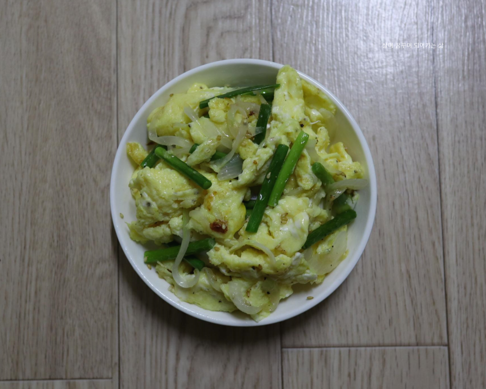 스크램블에그와 볶은 마늘종과 양파를 골고루 섞어 줍니다.