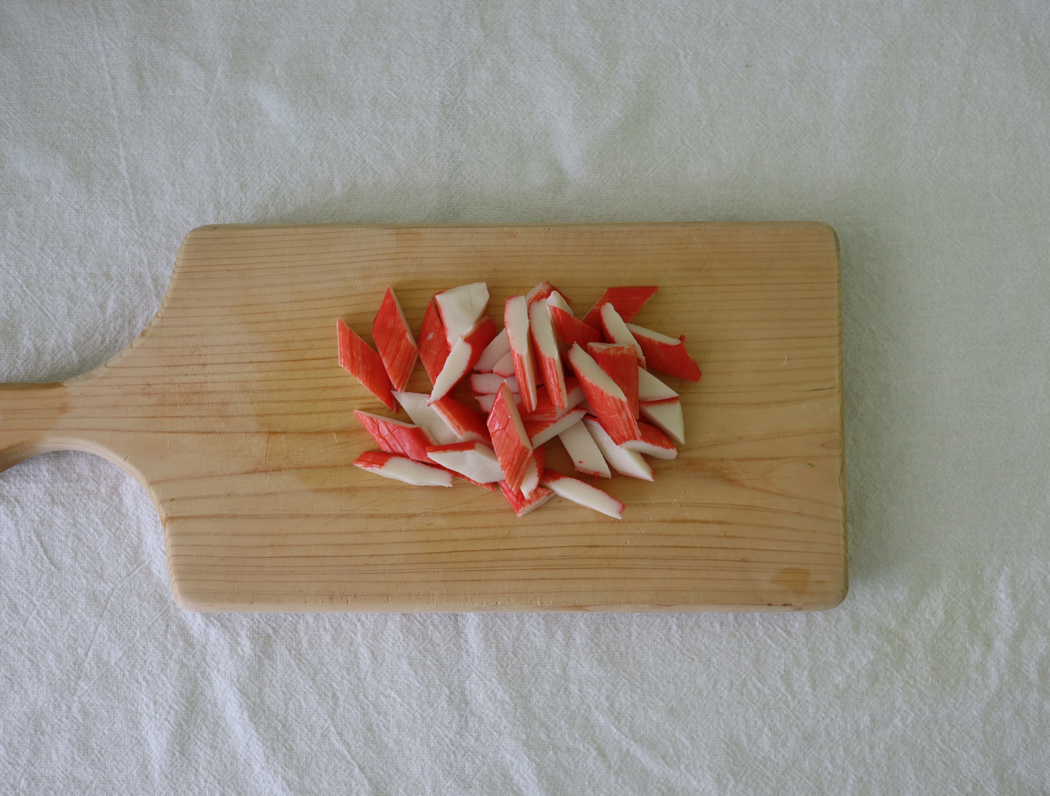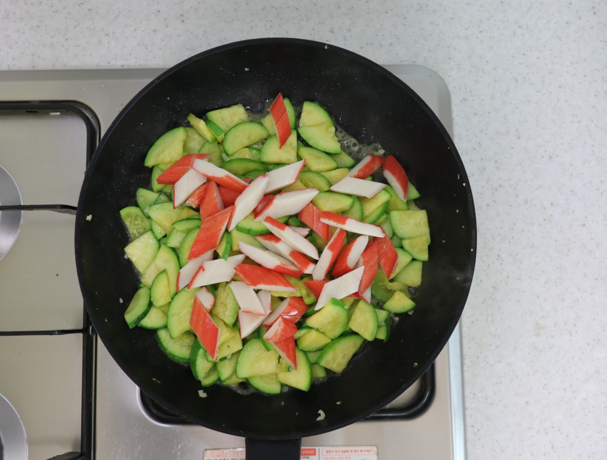 호박이 적당히 익으면 약불로 줄여서 맛살을 넣고 살짝 볶아 줍니다. 맛살은 오랫동안 볶으면 쉽게 부서집니다.