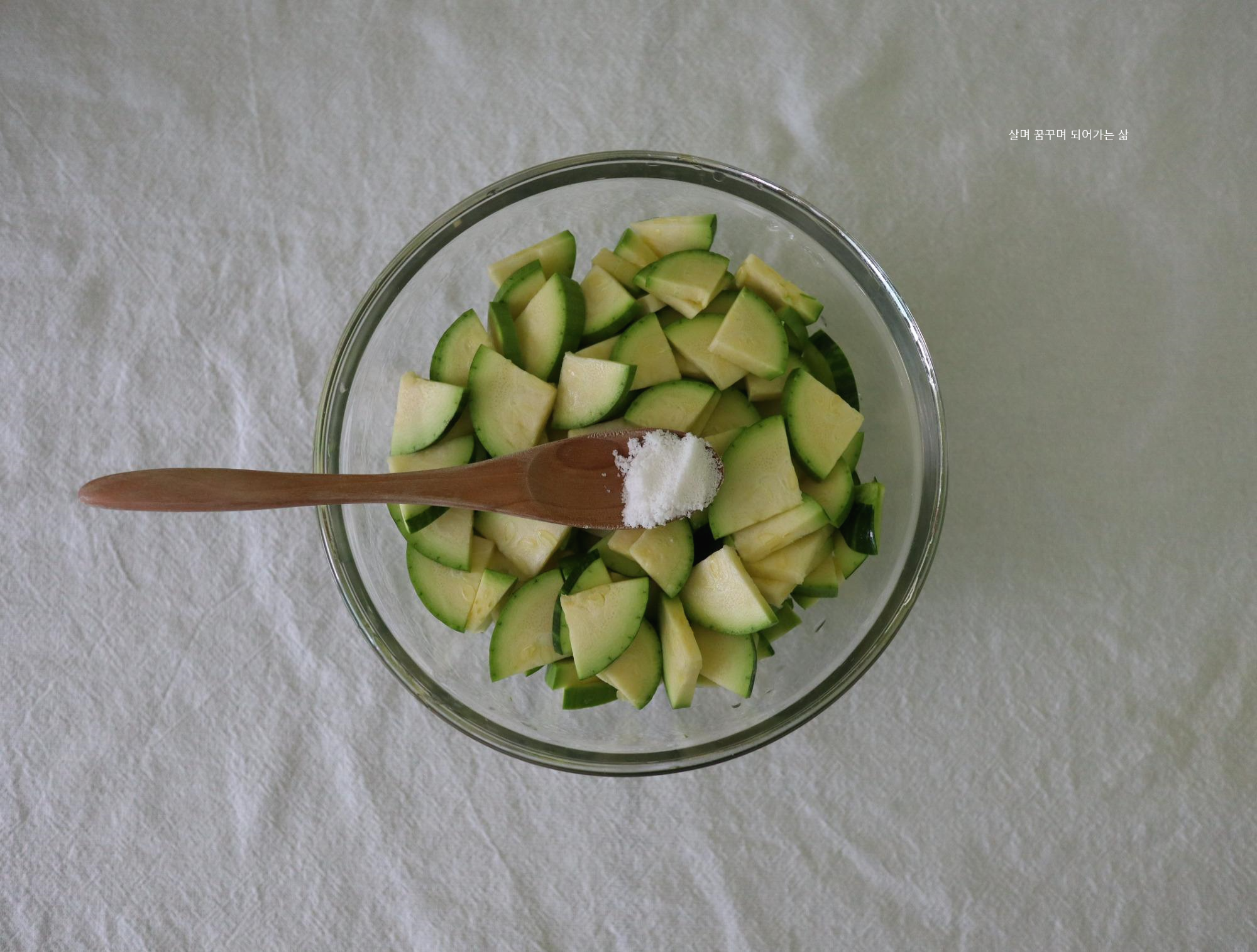 5분정도 절여주는데, 살짝 절여서 볶으면 호박이 부서지지 않아서 요리가 깔끔해집니다.