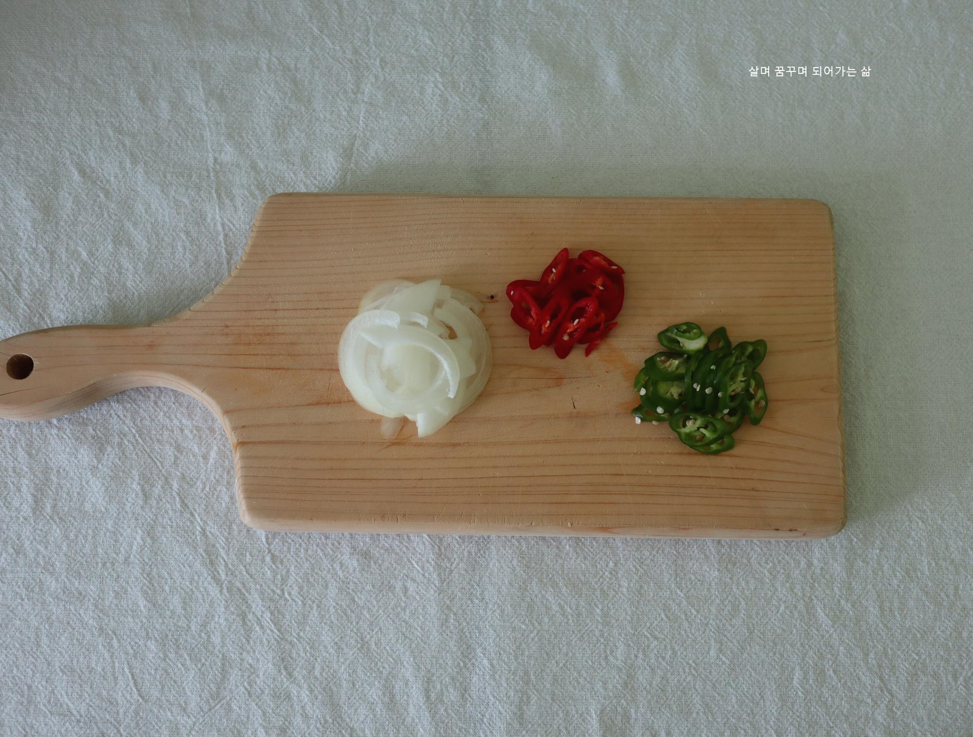 함께 넣을 부수적인 재료 양파, 청양고추, 빨간고추 채썰어 주었습니다.
