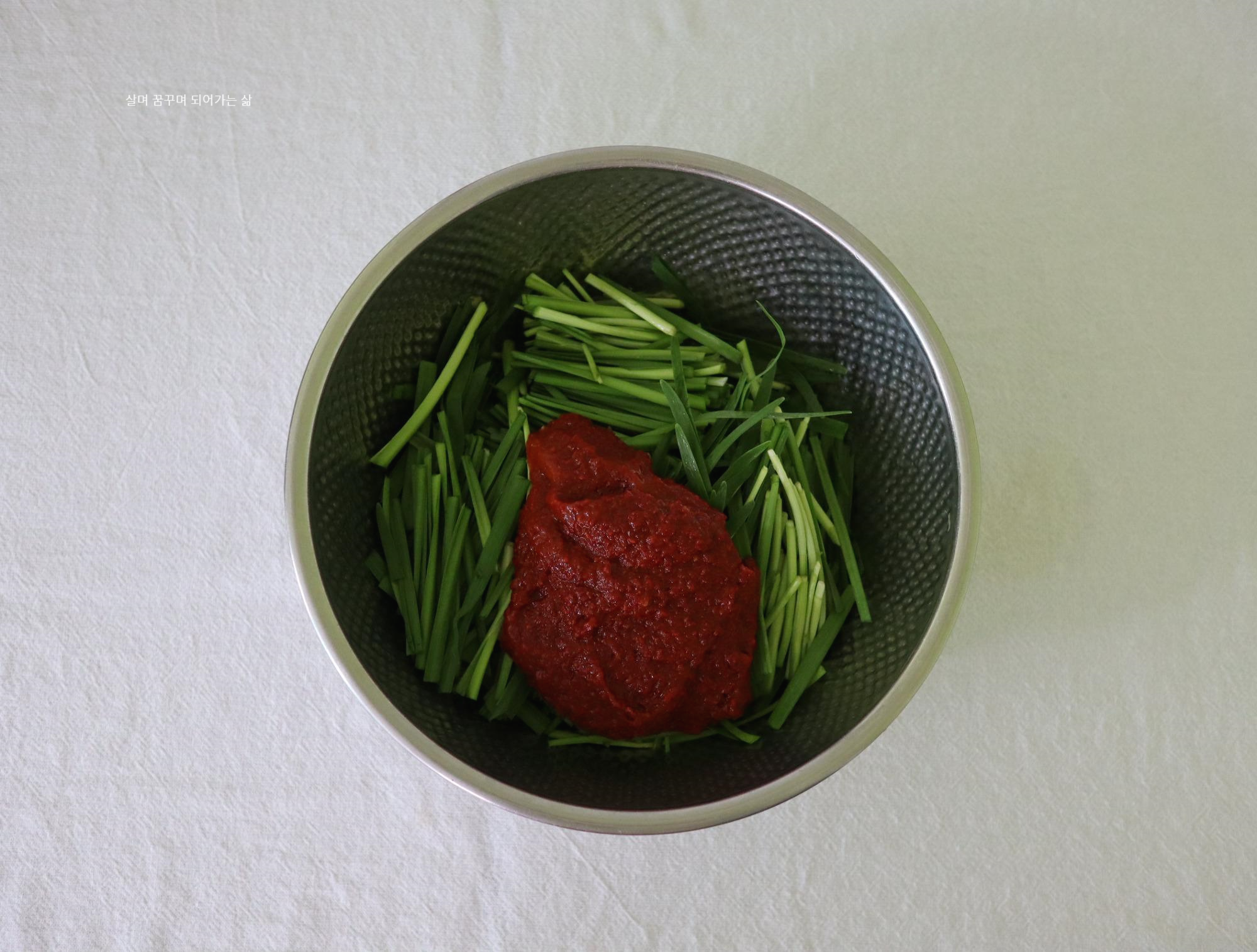 부추에 양념장을 넣어 줍니다.