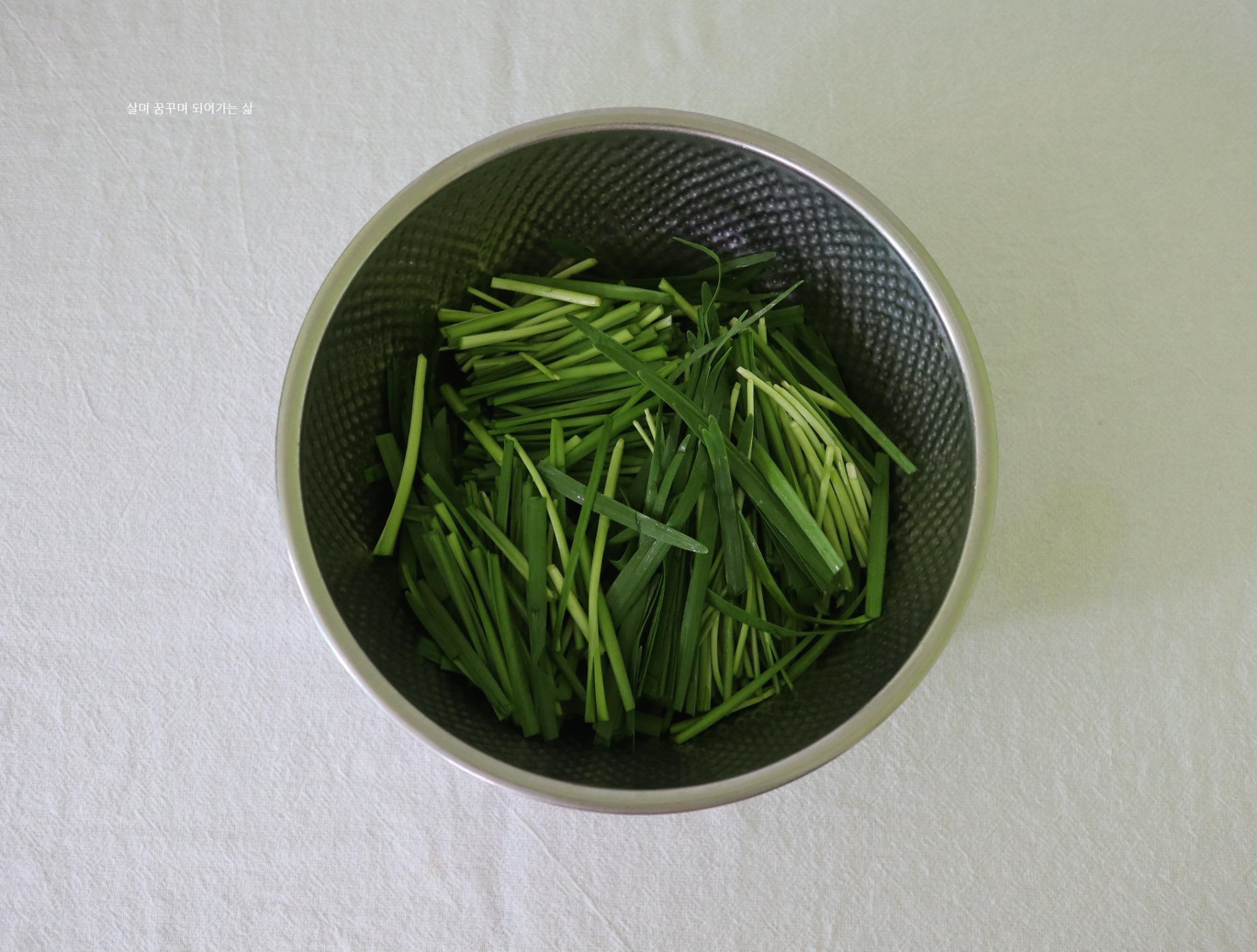 나물무치듯이 문지르면 부추에 멍이 들기 때문에 멍이 들지 않게 합니다.