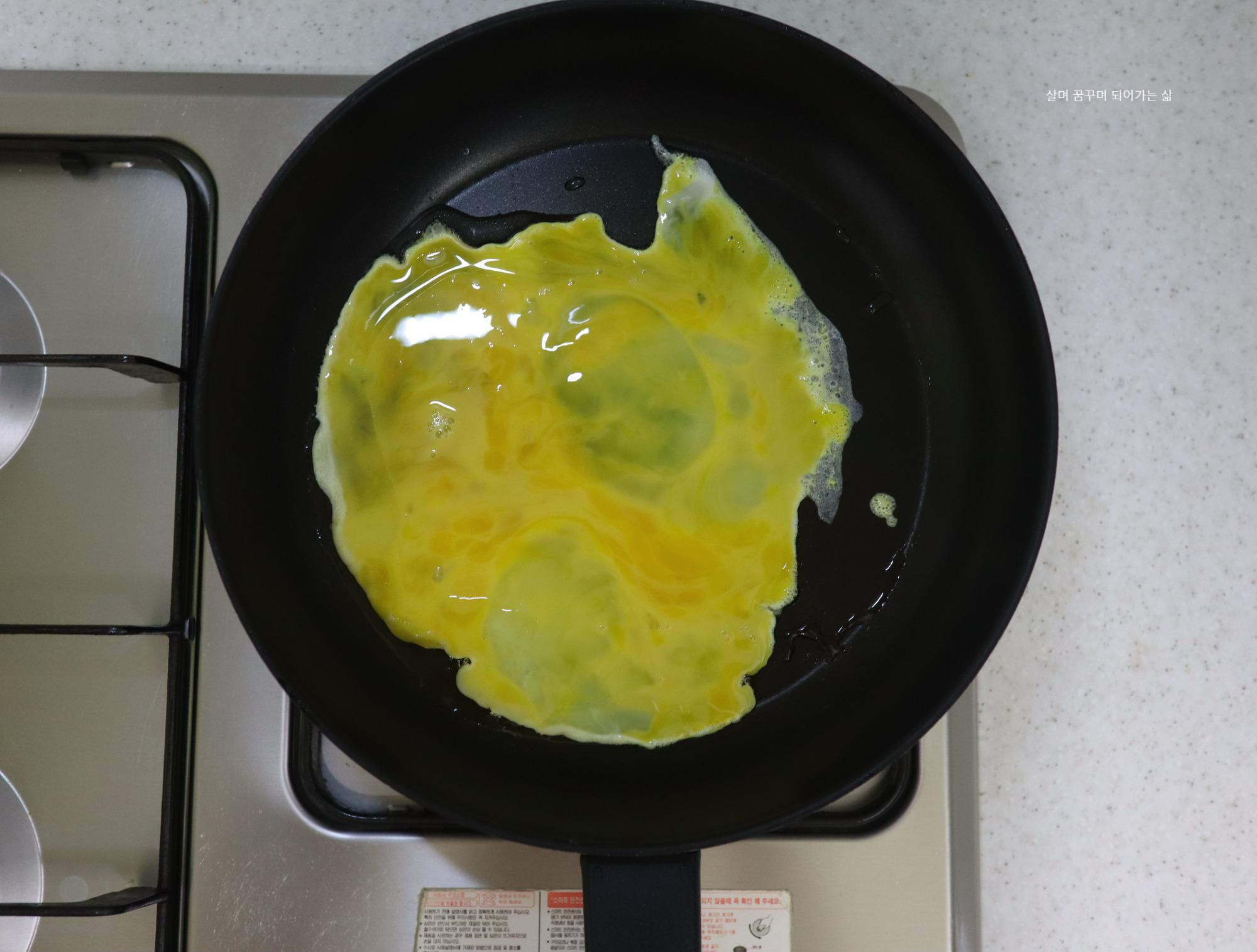 달걀물을 팬에 부어서 20초간 그대로 둔 다음 저어서 스트램블에그 완성했어요.