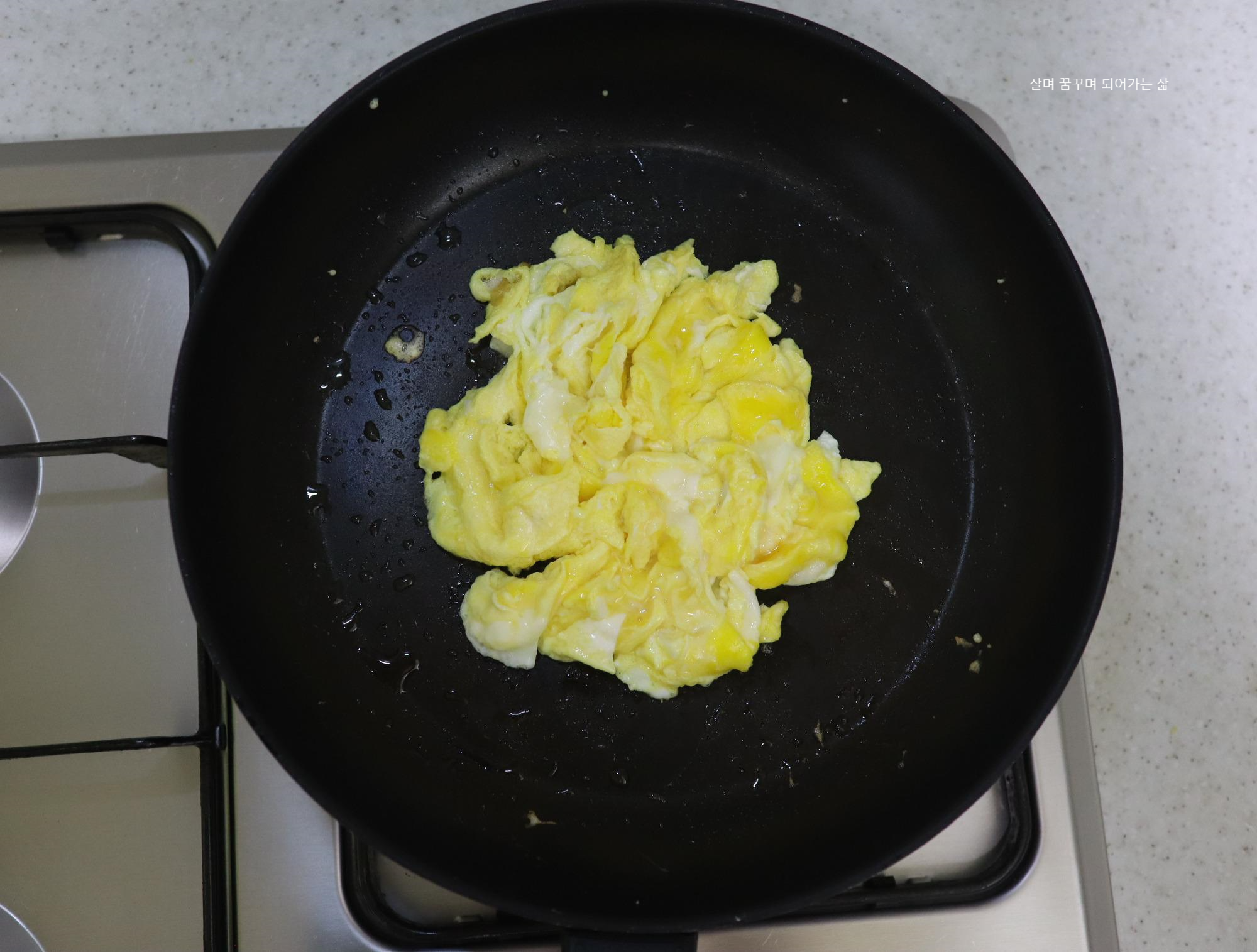 팬에 기름을 넉넉히 두르고 스크램블 에그를 만들어 주었습니다.