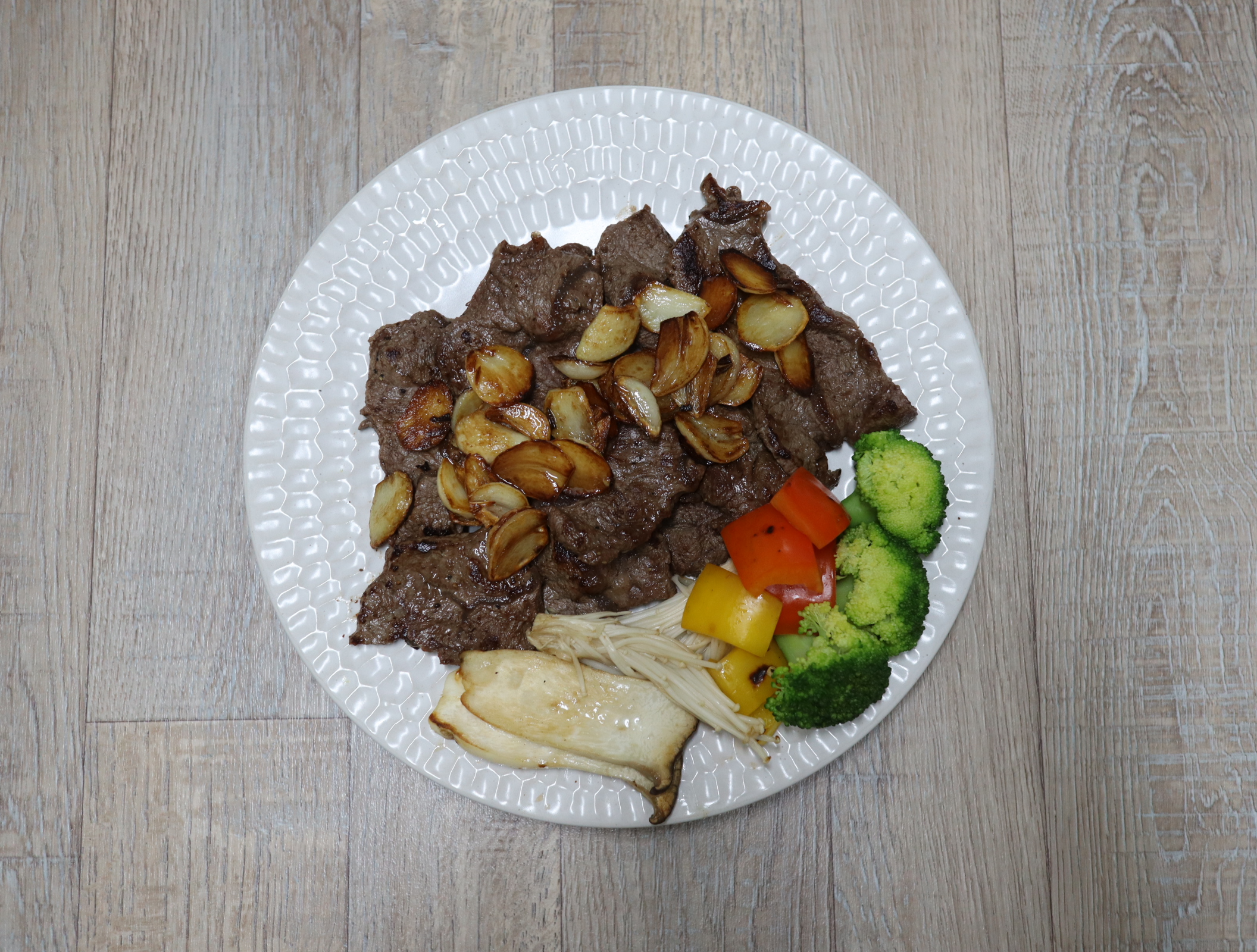 잘 구운 소고기 먼저 담았어요. 그 위에 구운 마늘 올려주고 옆에 데친브로컬리, 구운 버섯, 파프리카를 이쁘게 놓아 줍니다.