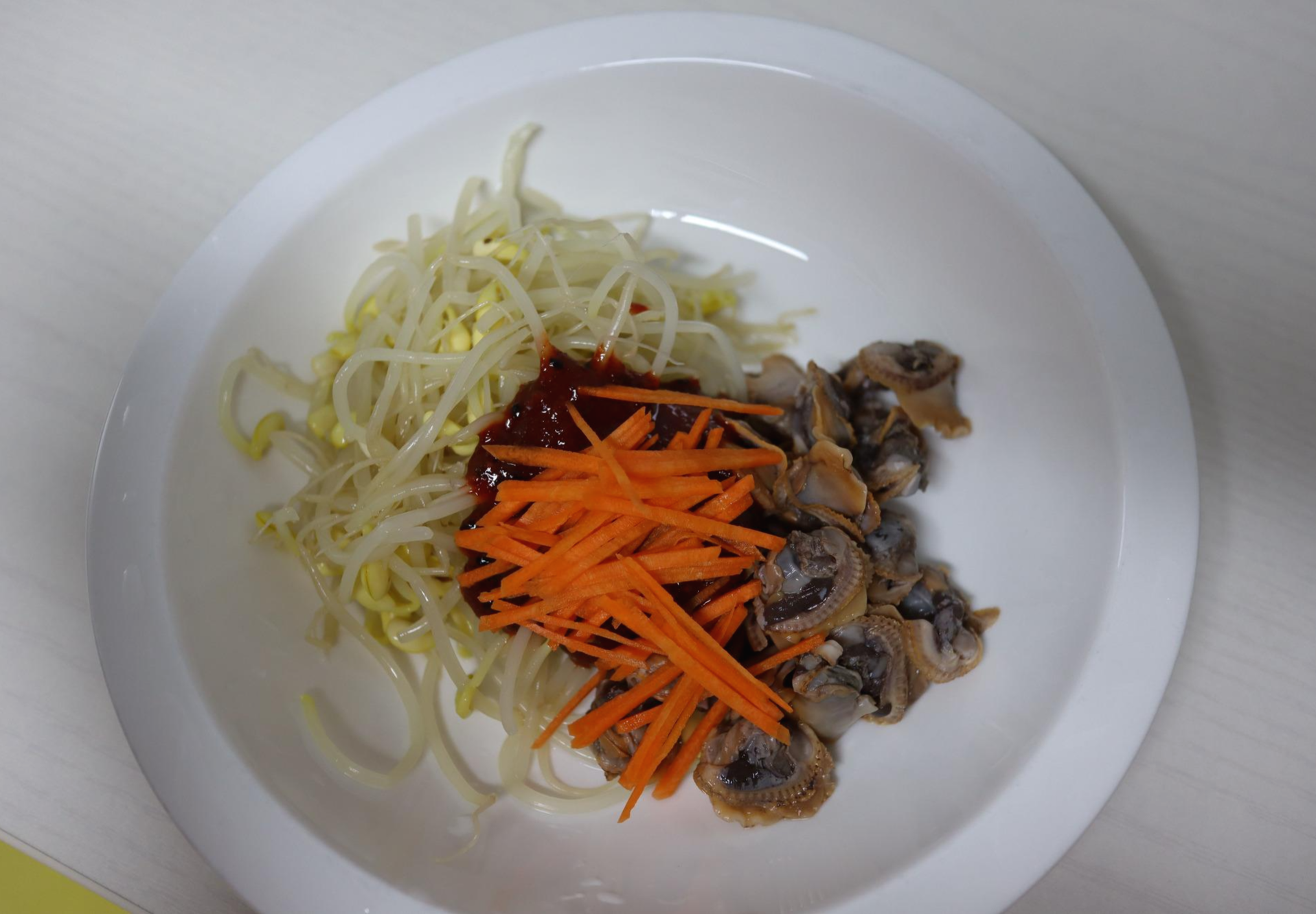 꼬막조갯살 1컵정도 , 콩나물2~3줌, 당근조금, 고추가루1T, 고추장1, 맛술1, 간장1T, 식초1T, 설탕1T, 다진마늘1T, 검은깨1/2T, 참기름1/2T.